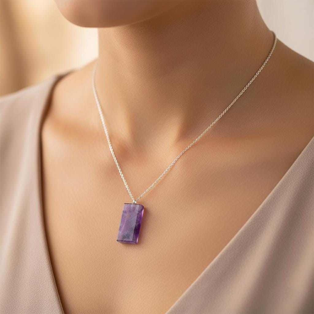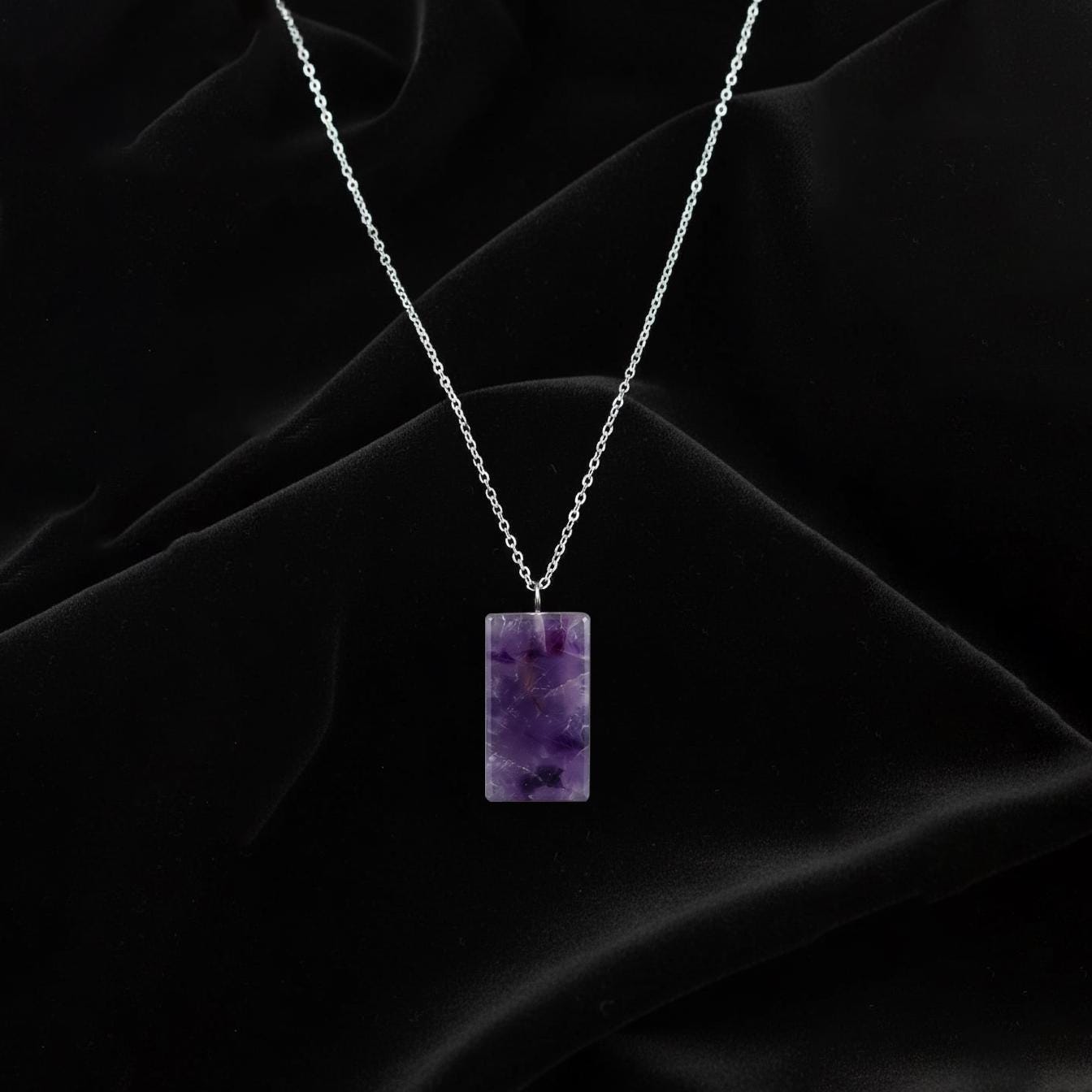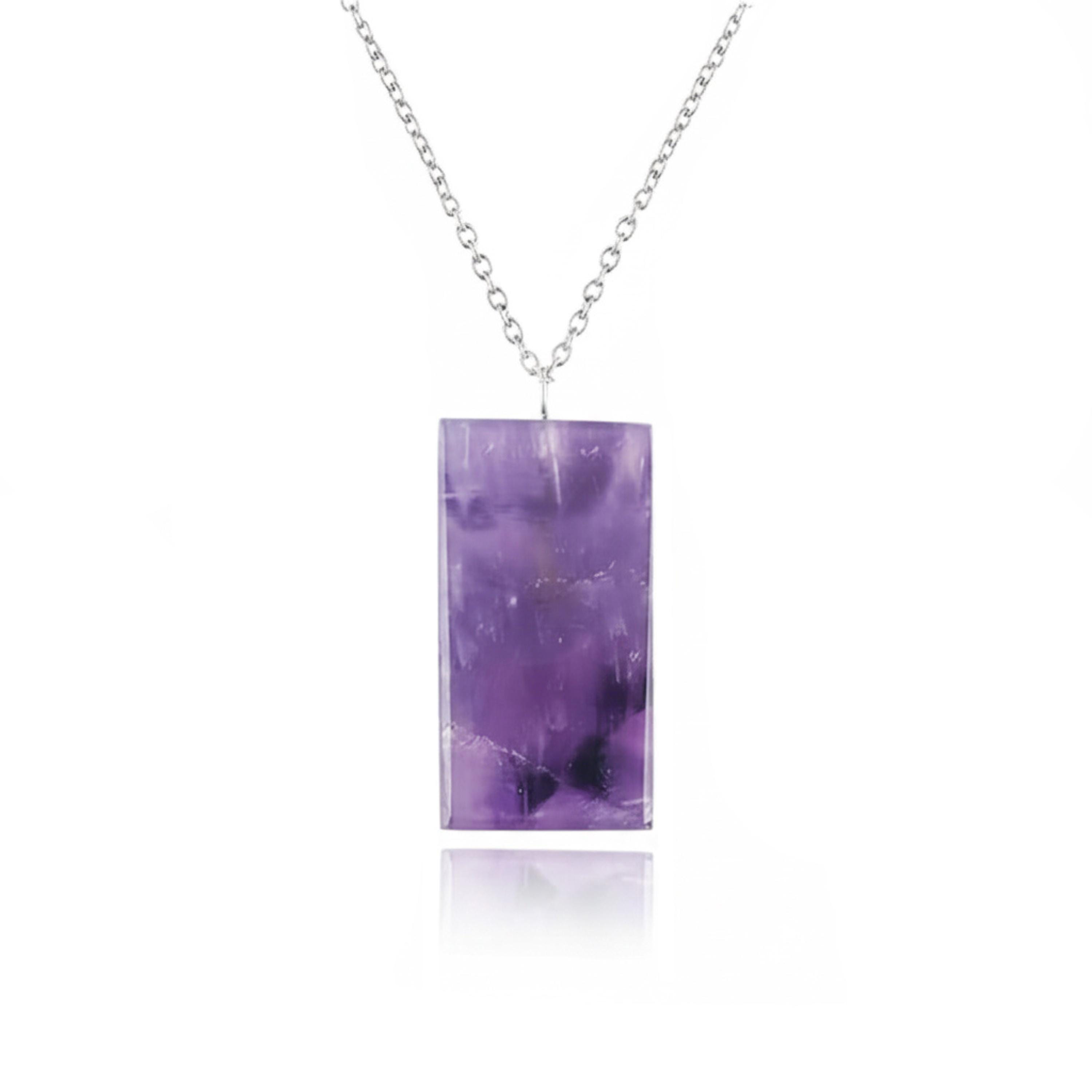 Amethyst is known as a stone of peace, balance, protection, and spiritual clarity, making this pendant both stylish and symbolic. Its clean, modern shape pairs effortlessly with casual outfits or layered jewelry looks.