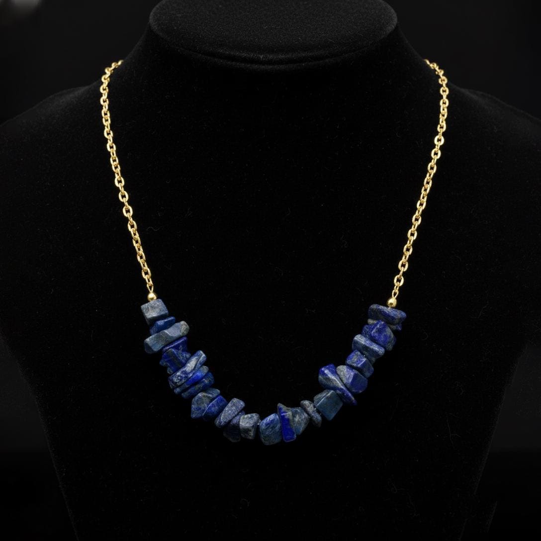 Elevate your style with this Natural Lapis Lazuli Chips Bar Necklace, handcrafted with deep blue lapis lazuli stone chips that reflect elegance, wisdom, and inner truth. Known as the Stone of Wisdom and Communication, lapis lazuli has been cherished for centuries for its rich color and spiritual significance.
