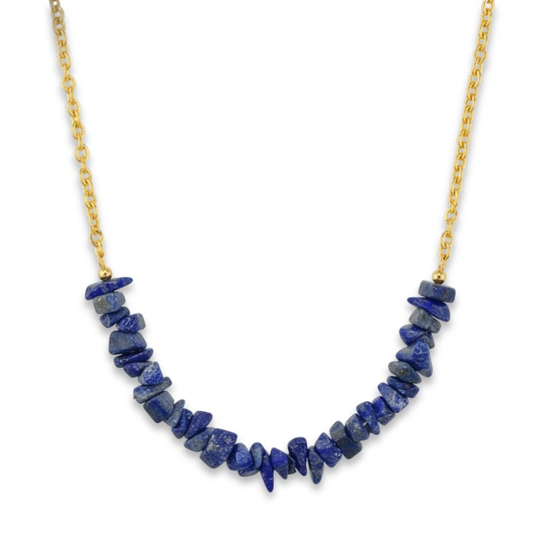 Stone: Natural Lapis Lazuli Chips Color: Deep Blue Metal: German Silver Plating: 18K Gold Filled Necklace Length: 18 inches + 2 inches adjustable Style: Chips Bar Necklace Finish: High polish Handmade: Yes