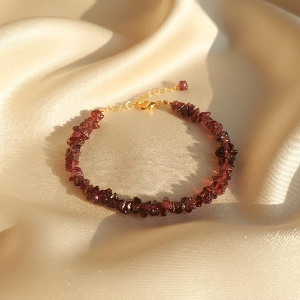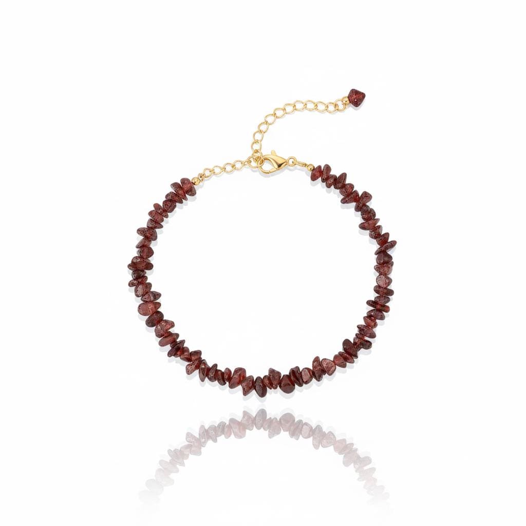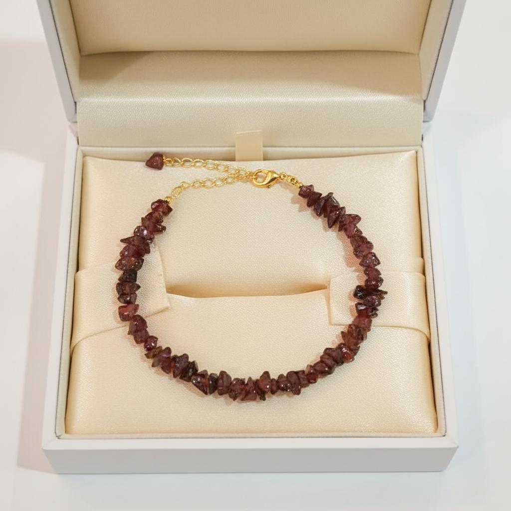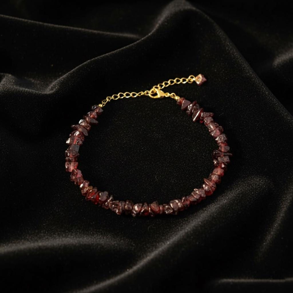 Elevate your everyday style with this elegant Garnet Chips Bracelet, crafted with natural deep red garnet gemstone chips. The bracelet features a German silver base finished with 18K gold filling, giving it a rich, luxurious look while remaining lightweight and comfortable.