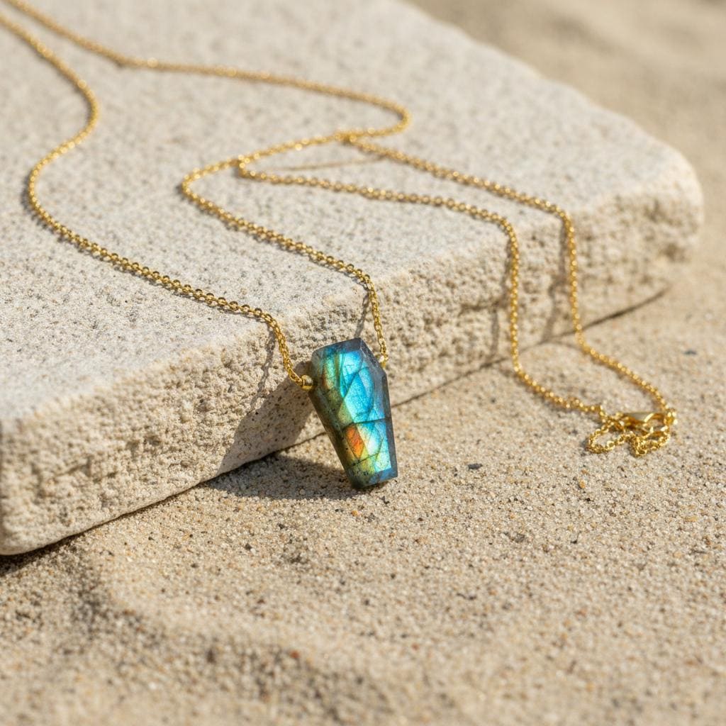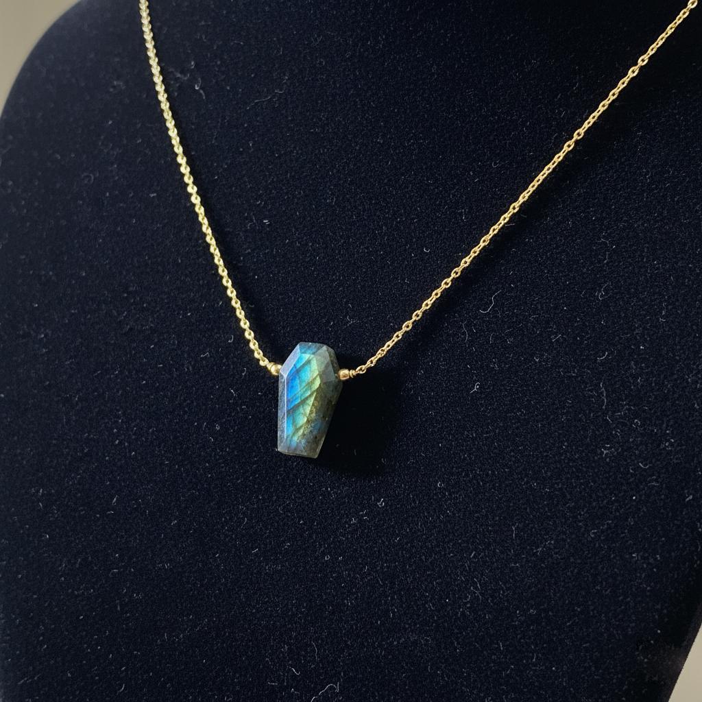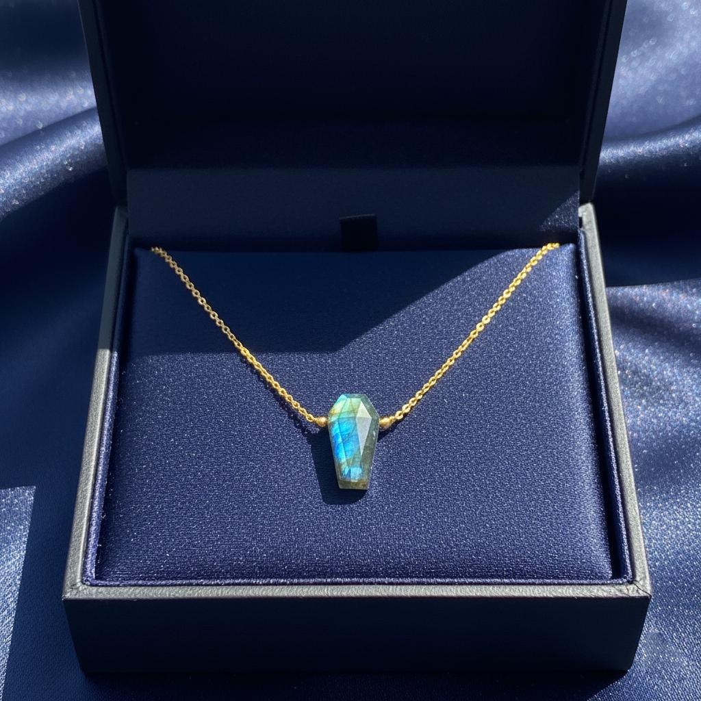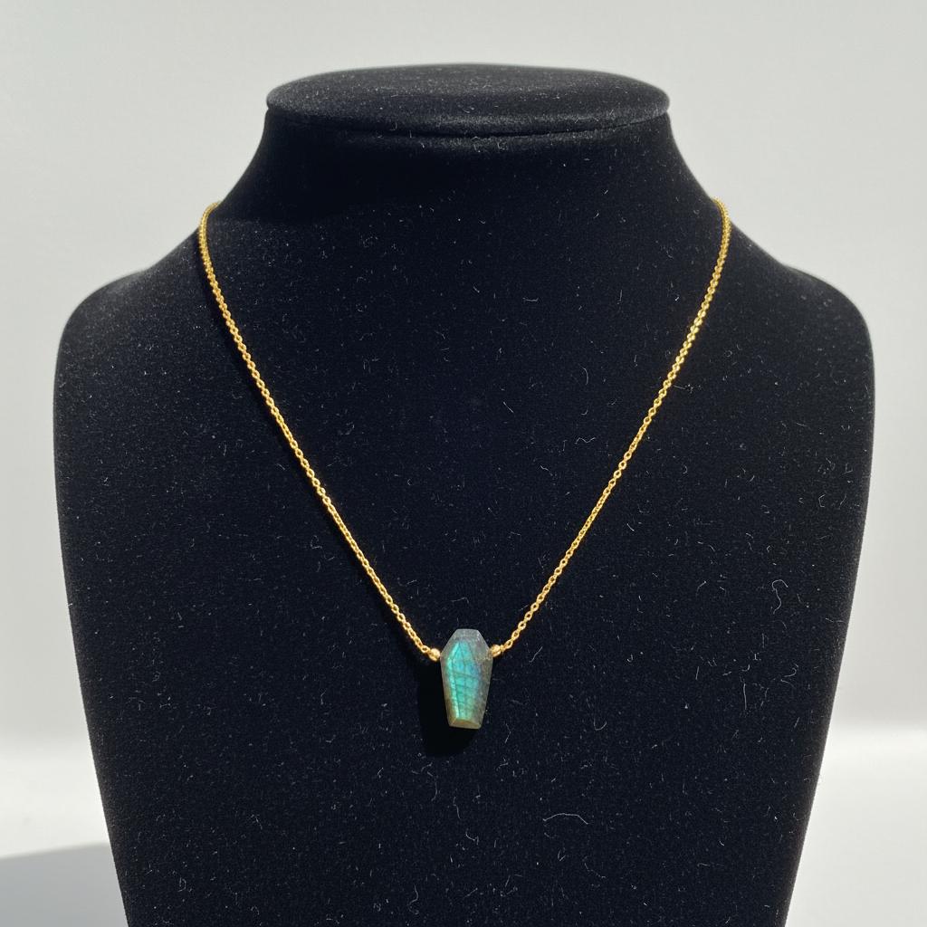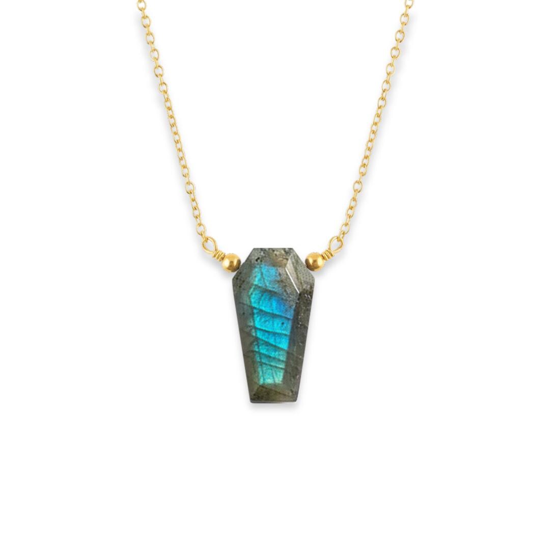 Add a mysterious glow to your jewelry collection with this Labradorite Coffin Necklace, featuring a natural labradorite gemstone with stunning blue flash. The coffin shape gives this pendant a bold gothic edge, while the shimmering labradorescence keeps it elegant and unique.