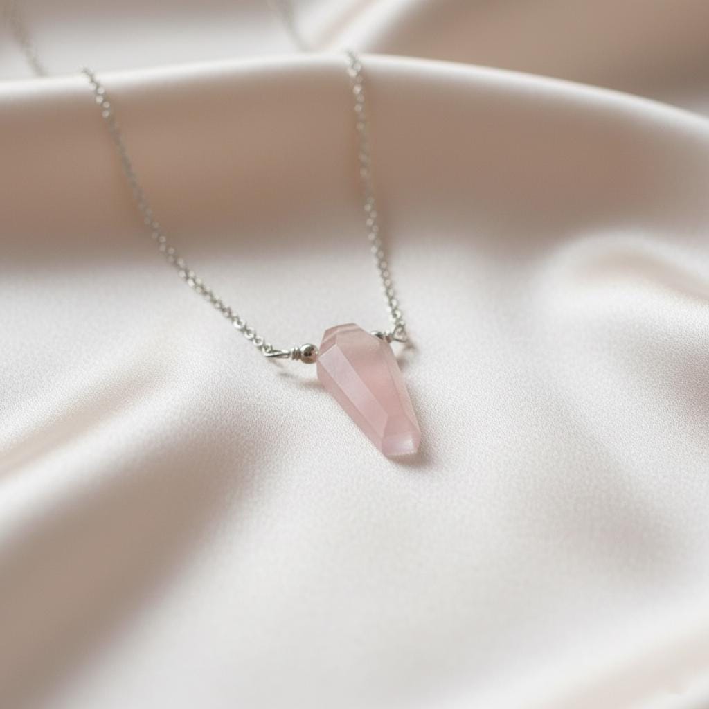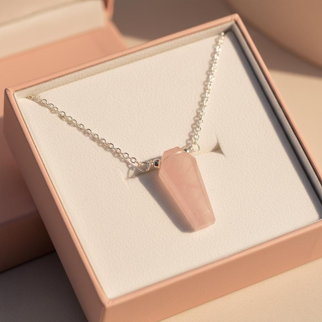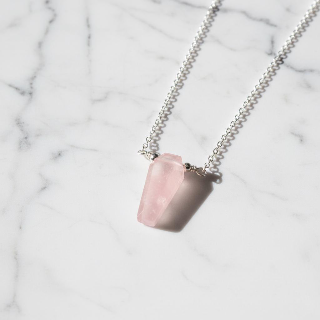 The coffin silhouette gives this necklace a modern gothic edge, while the blush pink stone keeps it elegant and minimal — perfect for everyday wear or meaningful gifting.