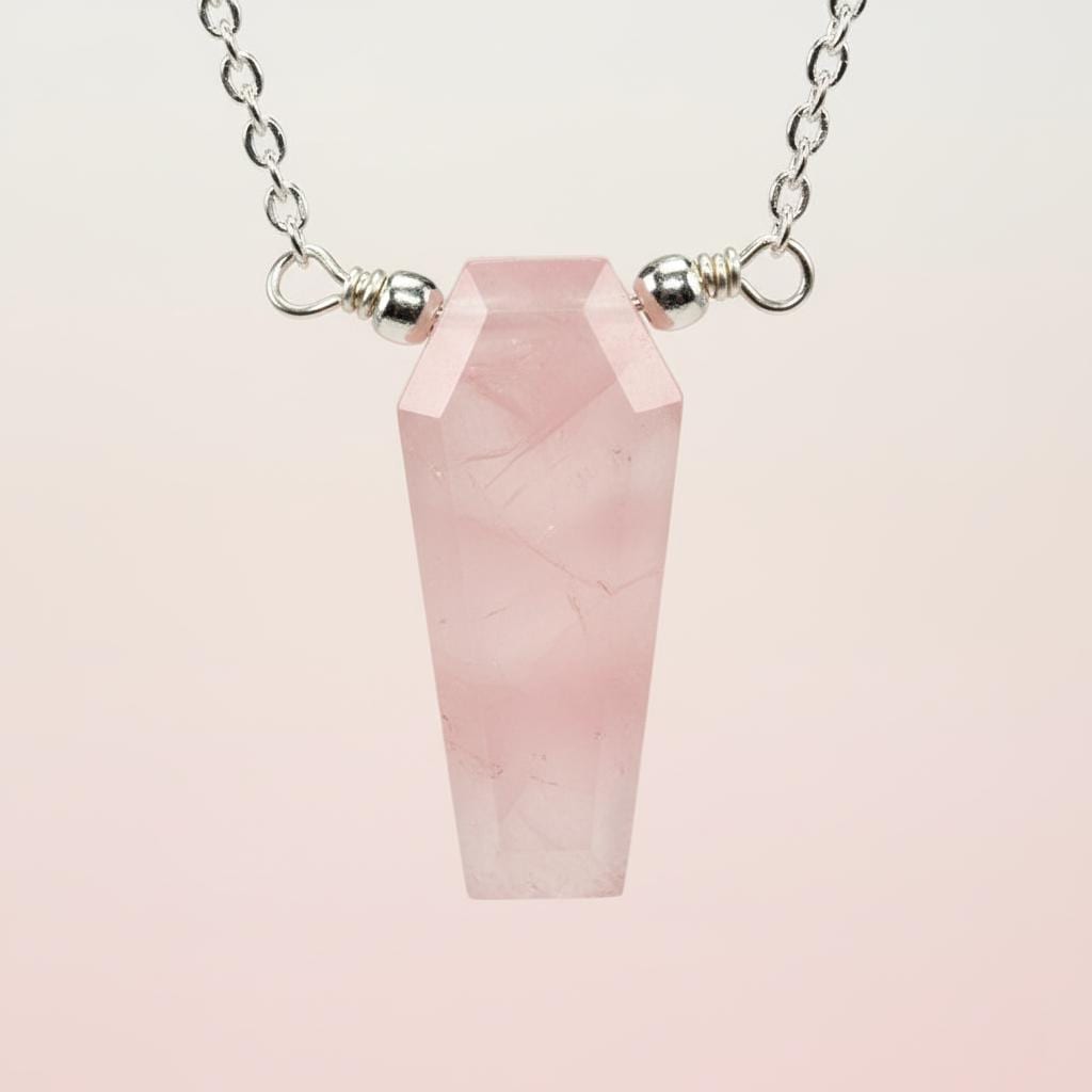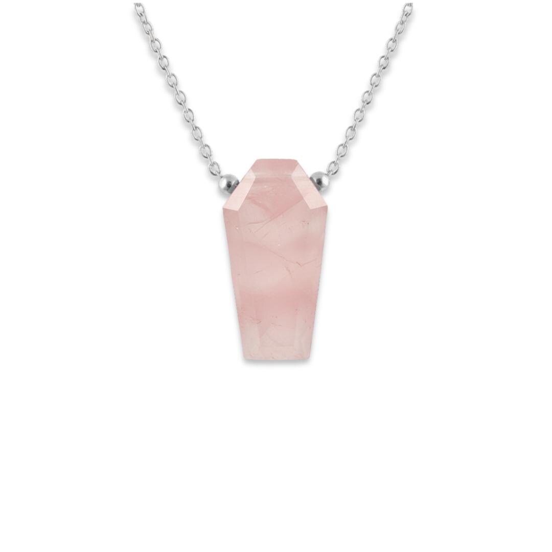 This Rose Quartz Coffin Necklace features a soft pink natural rose quartz gemstone, hand-cut into a bold coffin shape. Known as the stone of love, compassion, and emotional healing, rose quartz adds a gentle yet powerful energy to your jewelry collection.