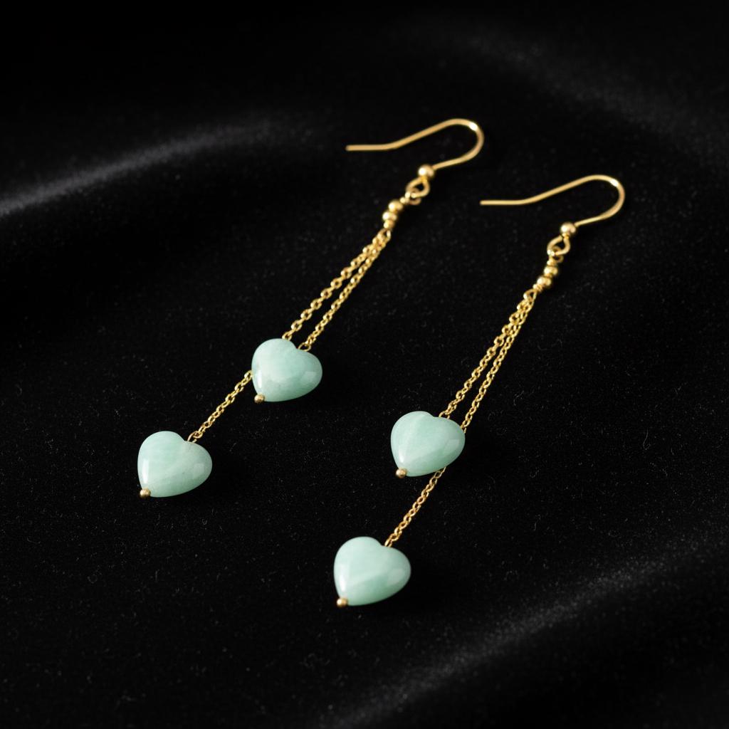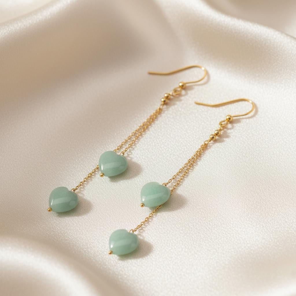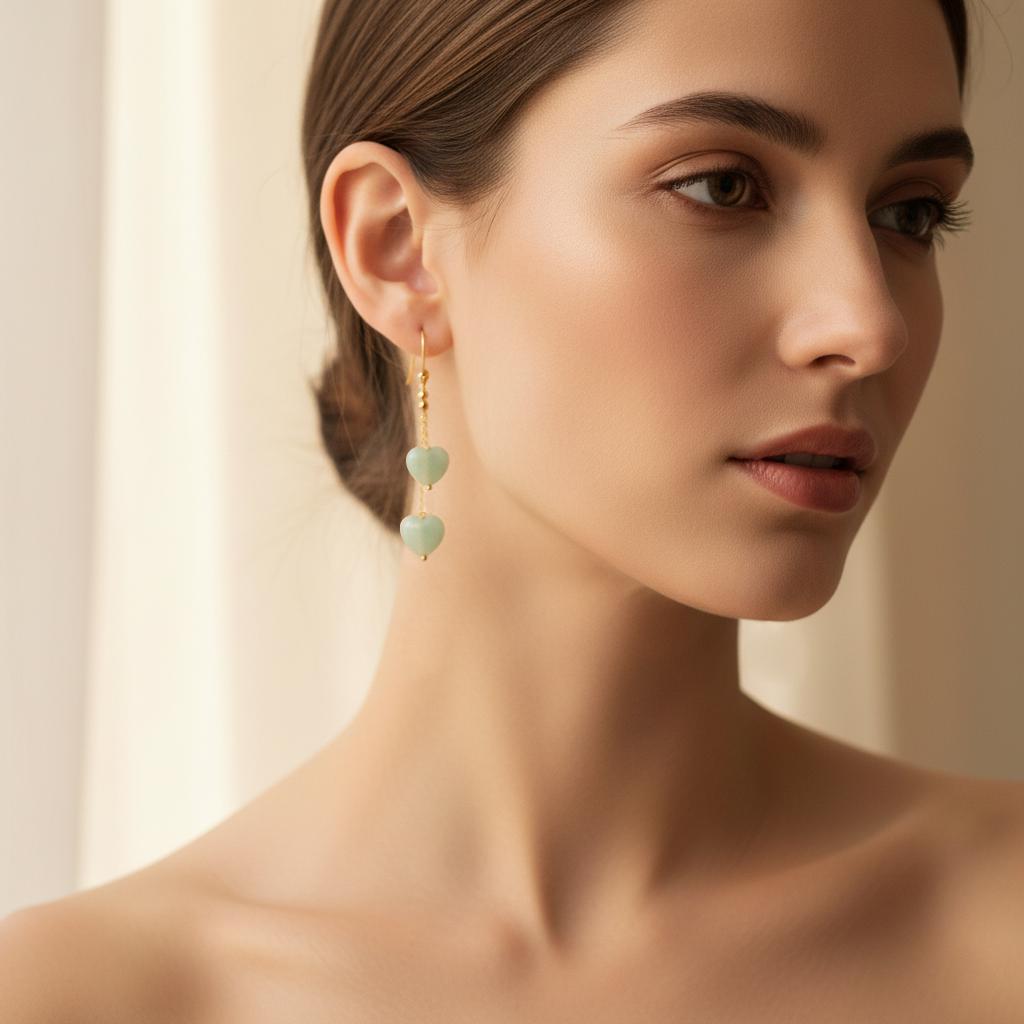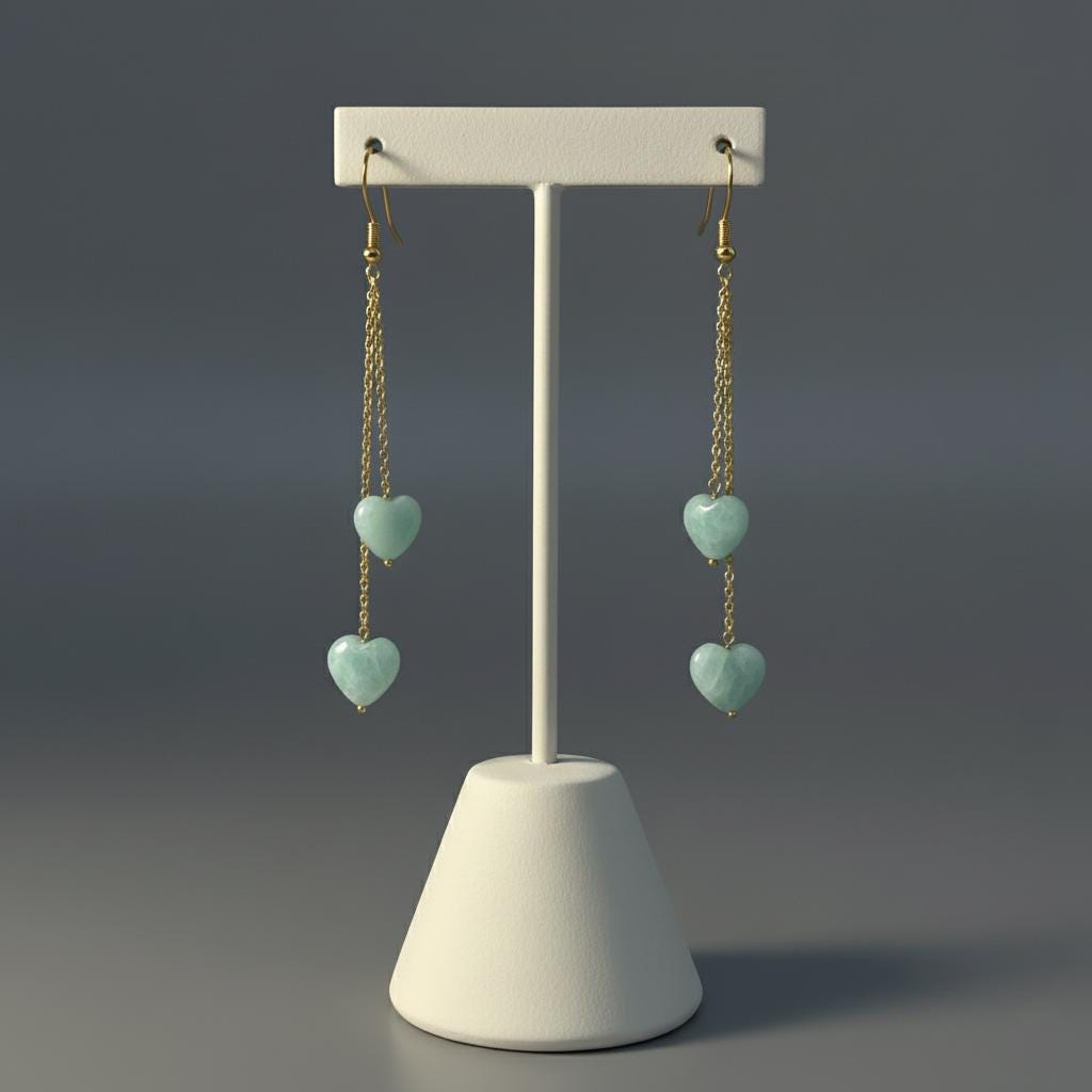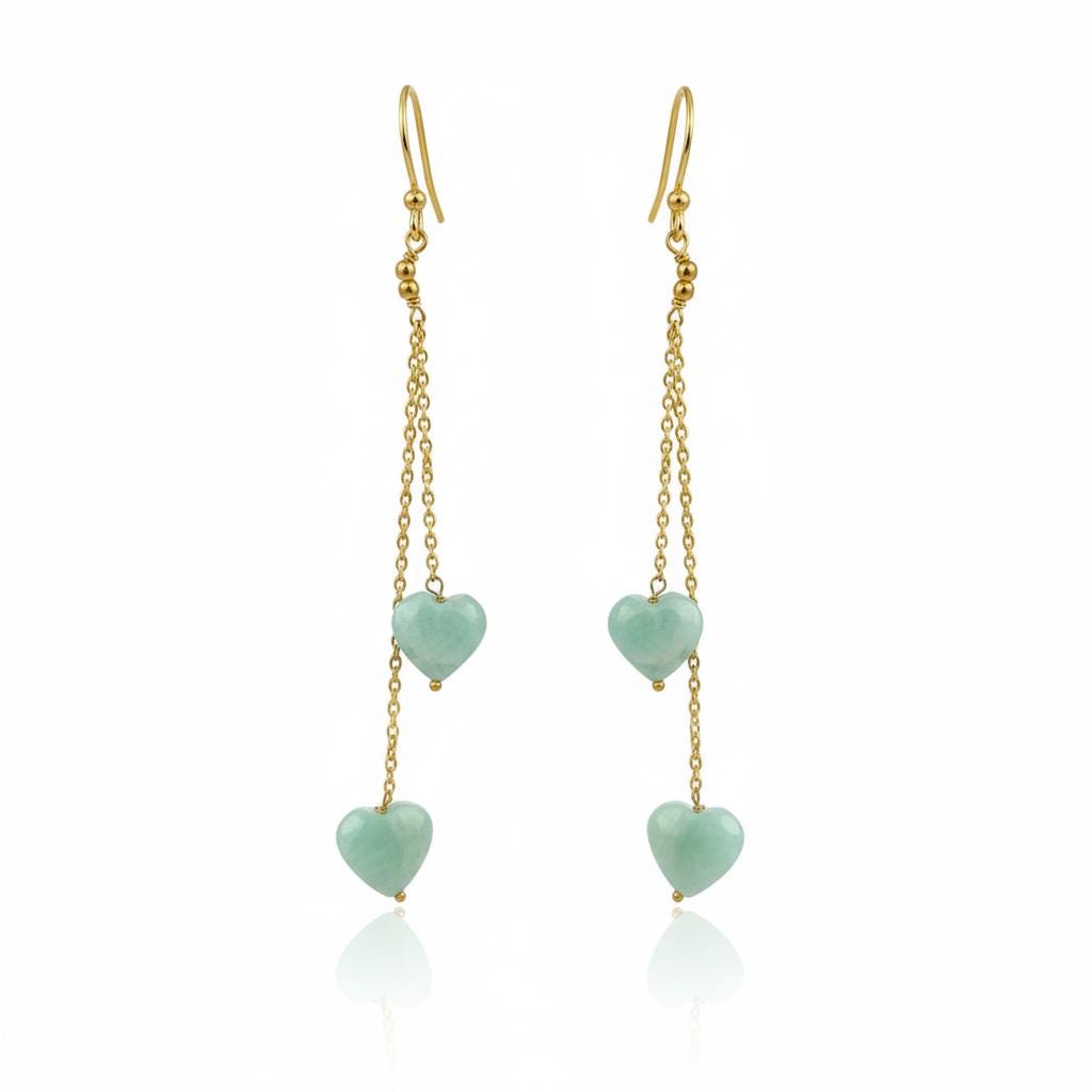 Each natural amazonite heart showcases soft sea-green tones with subtle natural variations, making every pair unique. The double chain drop design adds beautiful flow and movement, giving a graceful, elongated silhouette.