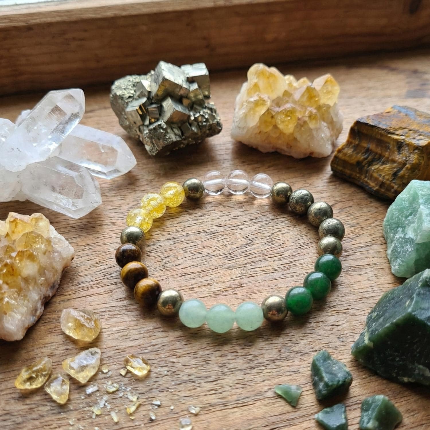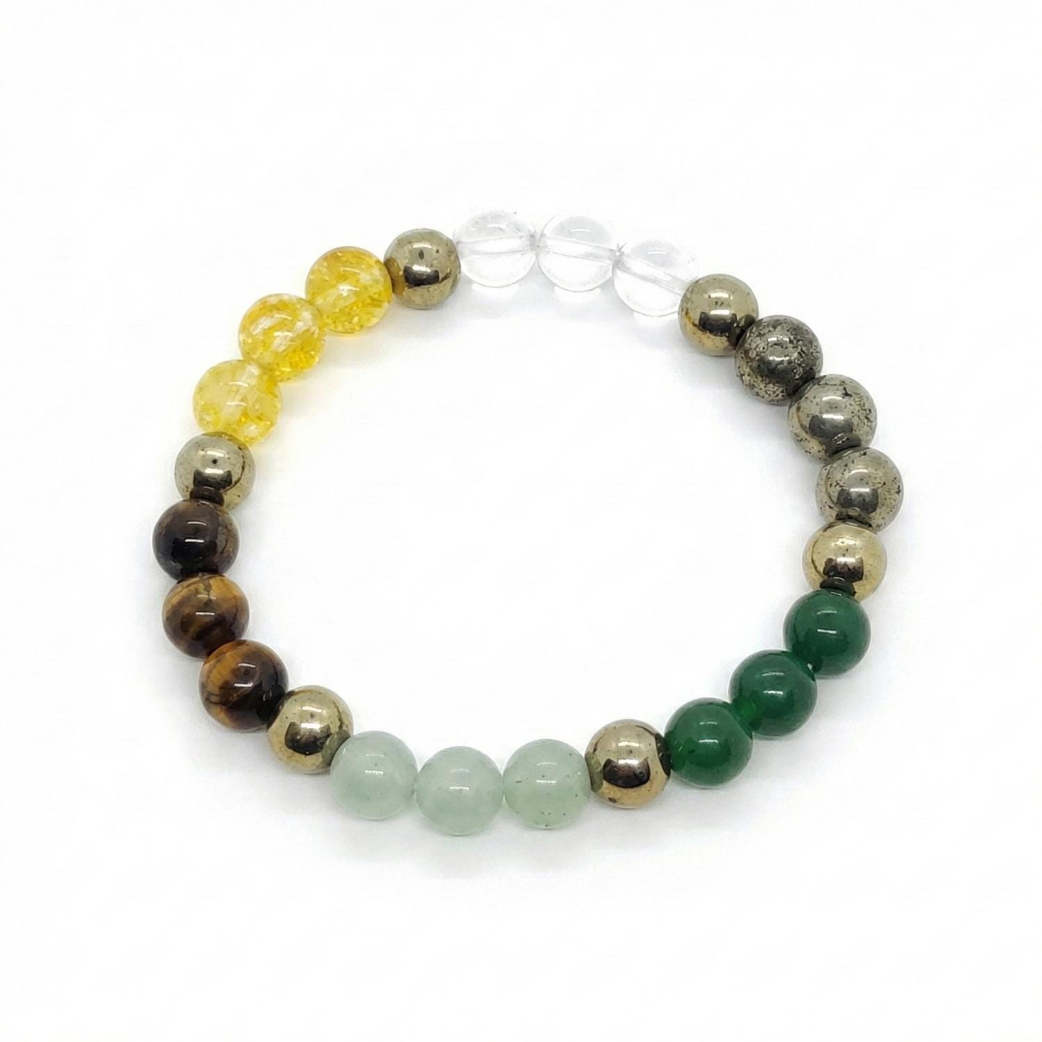 Materials: Genuine Pyrite, Citrine, Tiger’s Eye, Green Aventurine, and Clear Quartz.