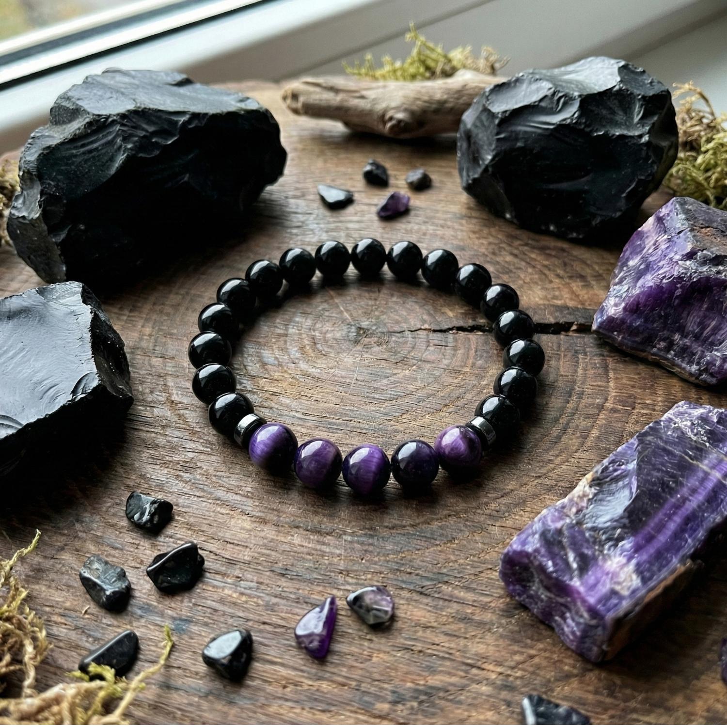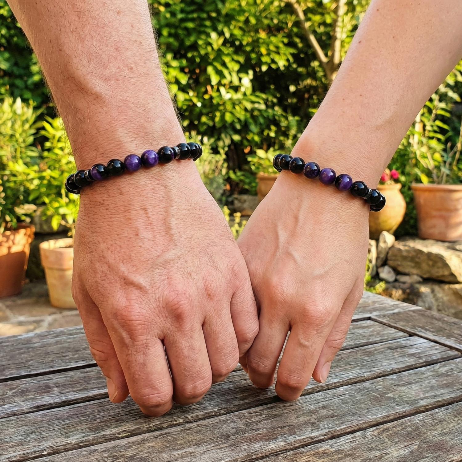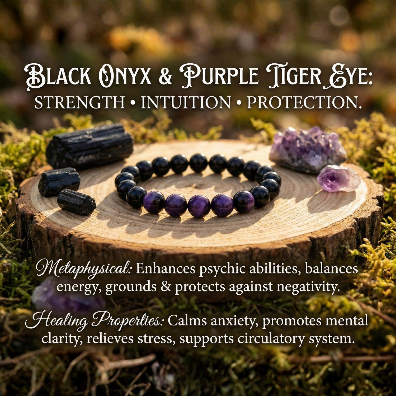 Step into your power and sharpen your intuition with this handcrafted Black Onyx & Purple Tiger Eye Protection Bracelet. This striking combination of "The Stone of Self-Mastery" and "The Royal Visionary" is expertly designed to provide a shield of protection while enhancing your spiritual awareness and mental clarity.